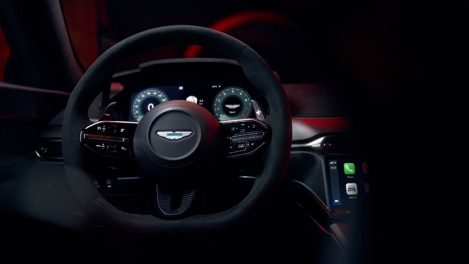 Vantage S, iç mekanda da özelleştirilmiş ‘S’ detayları ile devam ediyor; standart olarak sunulan benzersiz Alcantara® ve deri ‘Accelerate’ iç mekanı, mat 2×2 Twill karbon fiber trim kaplama şeritleriyle zenginleştirilmiş. Sportif görünümünü maksimize ederken, Vantage’a göre hafif bir ağırlık tasarrufu sağlayan bu iç mekan, ‘S’ modelinin özünü mükemmel şekilde yansıtıyor.